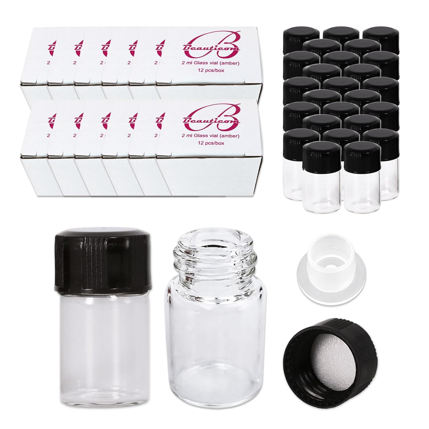Specification: Beauticom 2ML Clear Glass Vial 144 Pieces – 1/2 DRAM (1/16 OZ.) Clear with Screw Caps with Orifice Reducer and Dropper Top by Beauticom