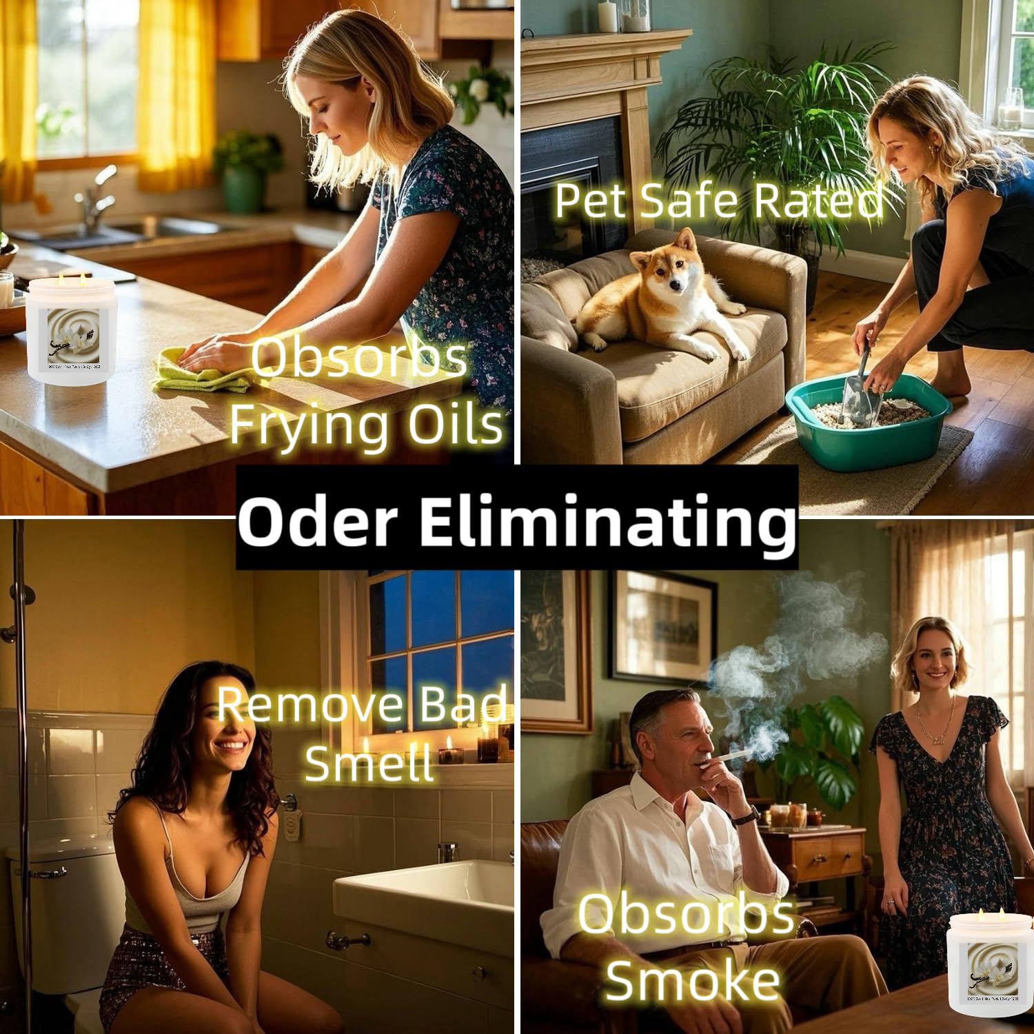 - Highly Scented Odor Eliminator Candle: Natural enzymes break down odor molecules at molecular level AND Dual-action technology neutralizes while adding vanilla freshness. IN Kitchen – absorbs frying oil/grease particles IN Bathroom – destroys ammonia-based odors