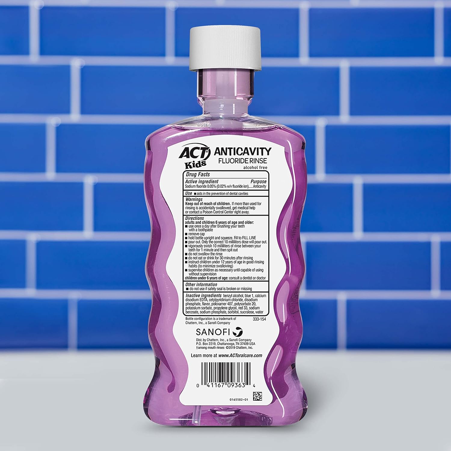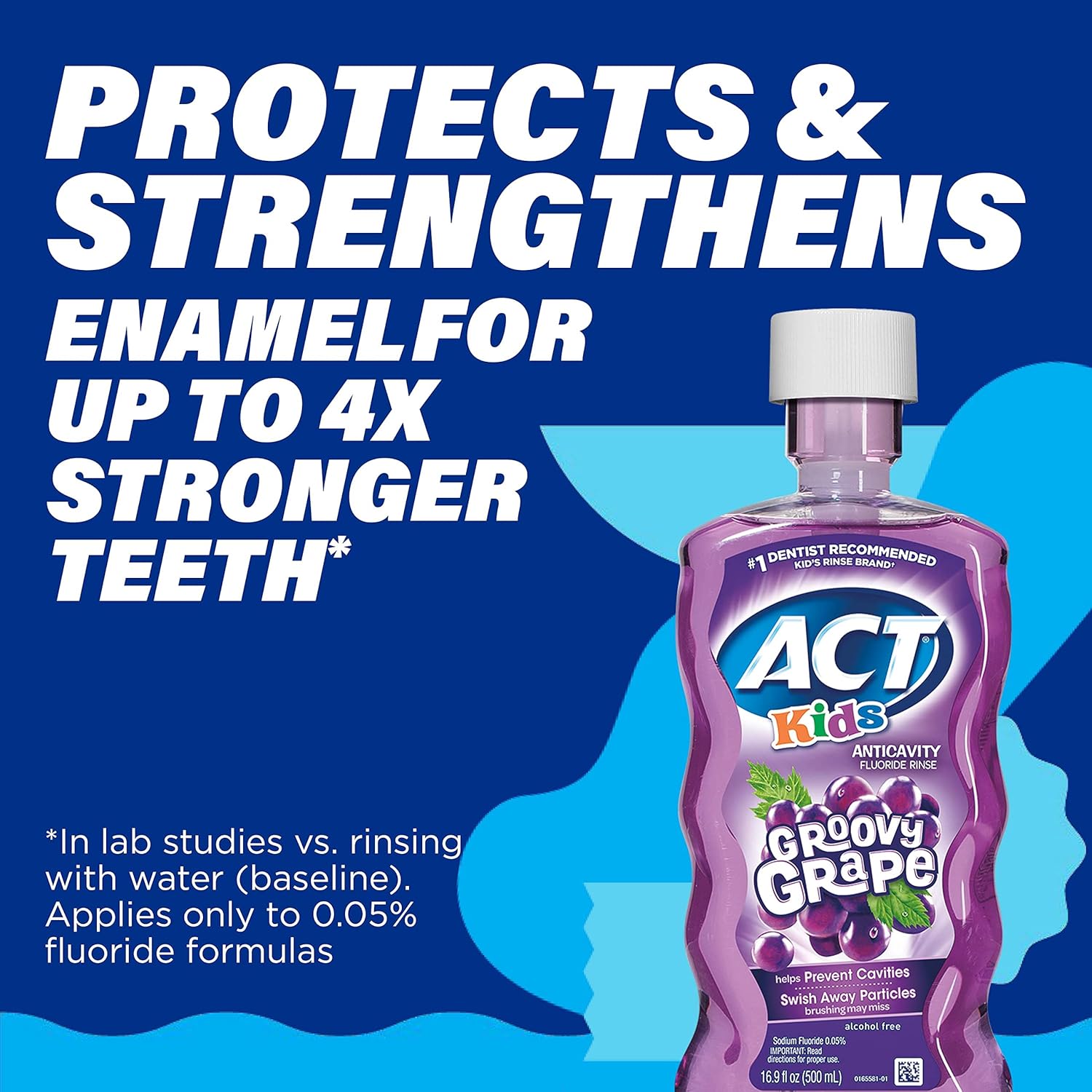 - Contains one (1) 16.9 fluid ounce bottle of ACT Kids Alcohol-free Anticavity Fluoride Rinse With Accurate Dosing Cup Groovy Grape Flavor