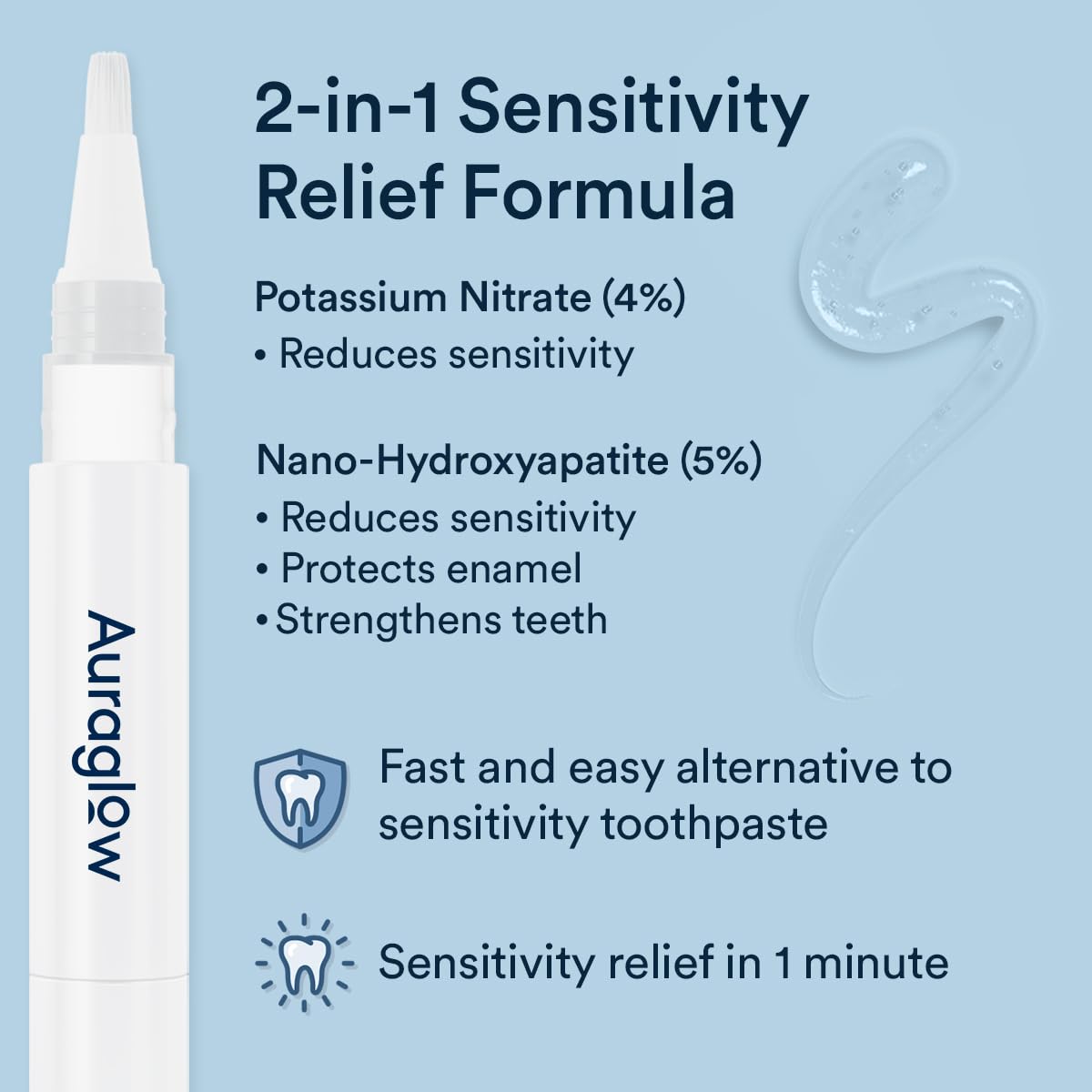 - [TOOTH SENSITIVITY RELIEF] Auraglow sensitivity relief serum is designed to reduce tooth sensitivity in under 1 minute. Use whenever you feel tooth sensitivity at home or on-the-go.