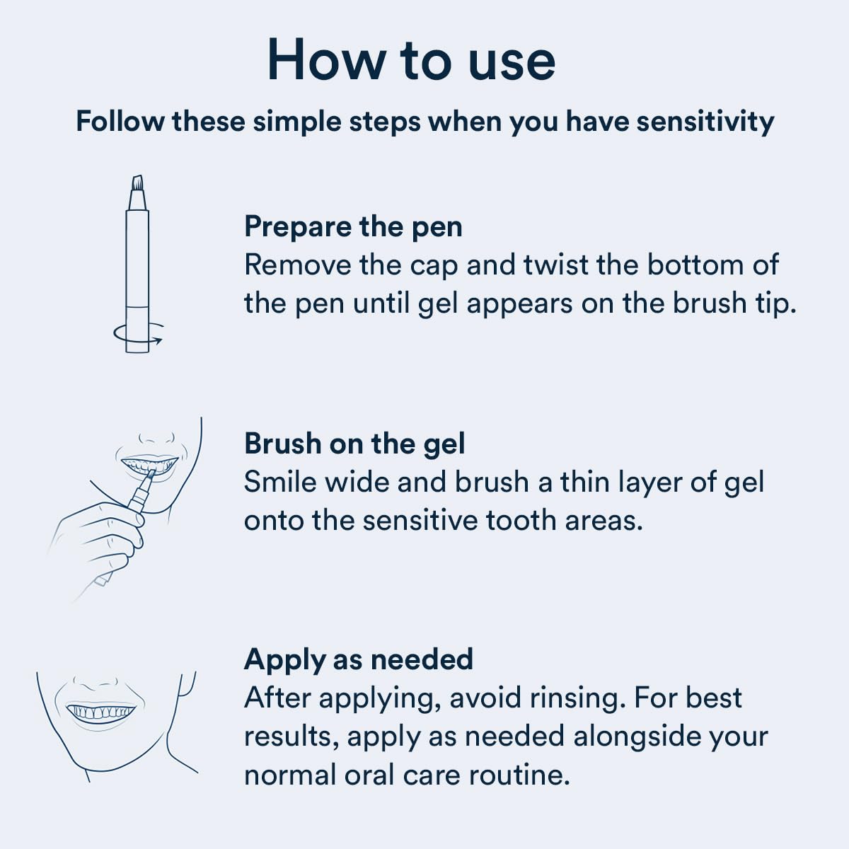 - [SENSITIVE TOOTHPASTE ALTERNATIVE] Finally you can get rid of tooth sensitivity without having to brush your teeth. Simply twist the pen and apply the gel to sensitive areas of your teeth!
