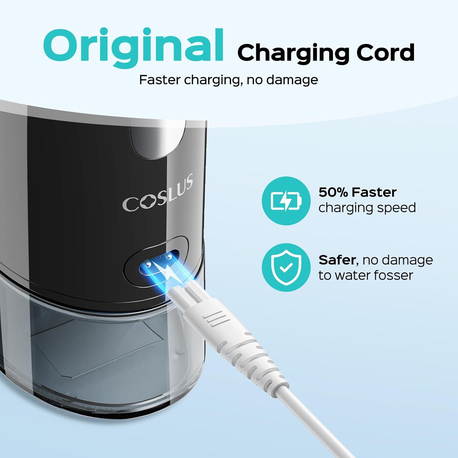 - Original Charging Cord, Faster Charging and No Damage: This original water flosser charger ensures compatibility with the original flosser, providing a 50% faster charging speed compared to non-original chargers. Using non-original chargers may damage the device and reduce its lifespan, so we recommend choosing the original charging cord