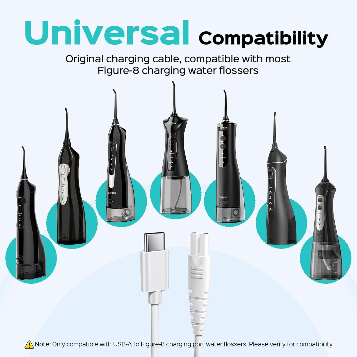 - Please Note: This water flosser charging cable is compatible only with specific models featuring an 8-pin charging port. If compatibility is not mentioned on the detail page, we recommend contacting COSLUS support for confirmation.