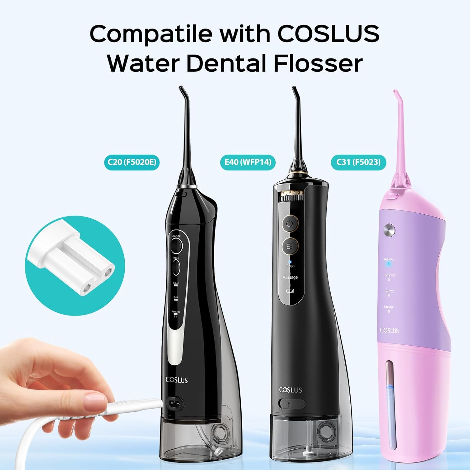 - Please NotePlease Note: This water flosser charging cable is compatible only with specific models featuring an 8-pin charging port. If compatibility is not mentioned on the detail page, we recommend contacting COSLUS support for confirmation.: This water flosser charging cable is compatible only with specific models featuring an 8-pin charging port. If compatibility is not mentioned on the detail page, we recommend contacting COSLUS support for confirmation.
