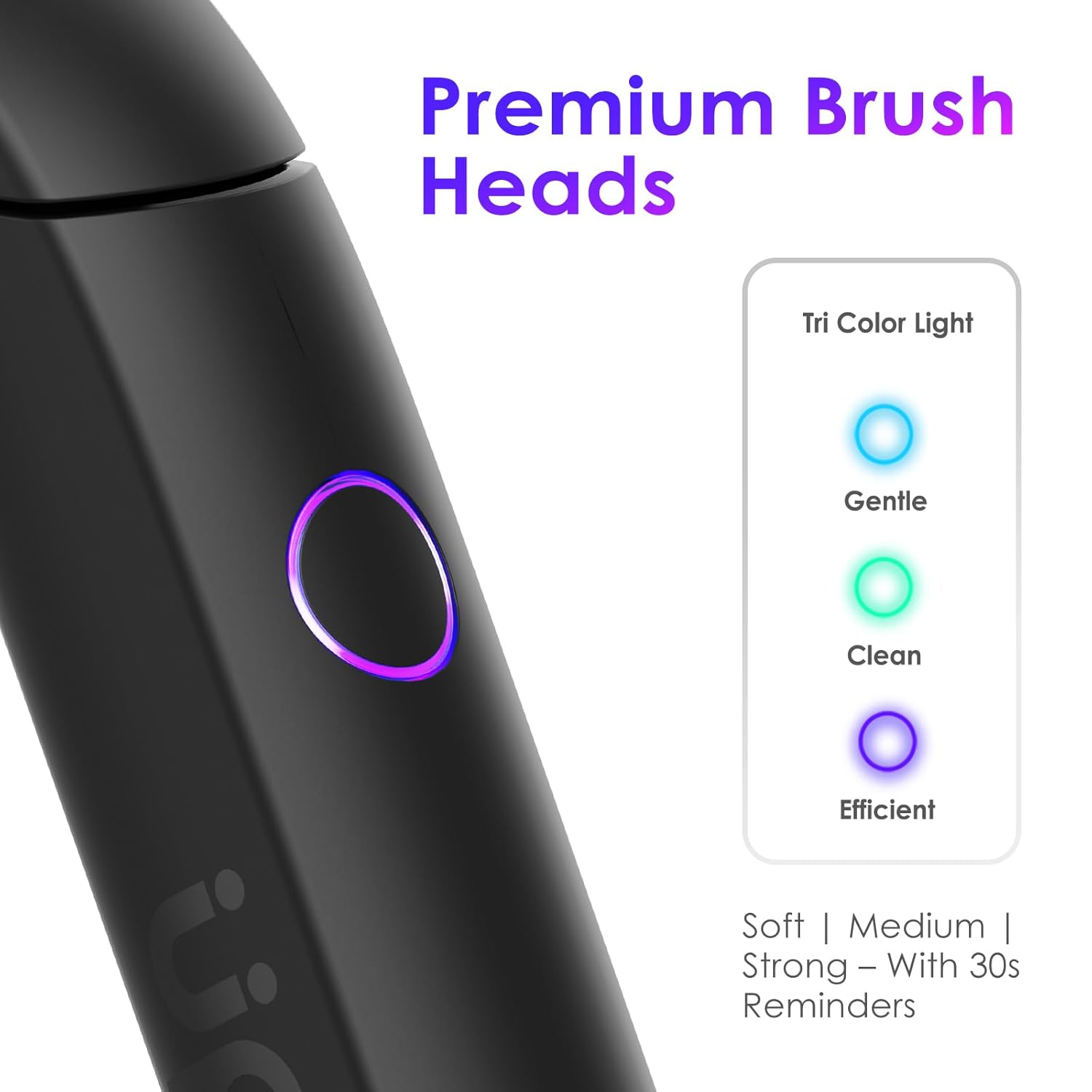 - 4️⃣ 3 Cleaning Modes + Built-in Smart Timer Simplify your oral care with 3 gentle brushing modes—Soft, Medium, and Strong. The built-in timer supports the recommended 2-minute routine, with automatic 30-second reminders to help you brush evenly.