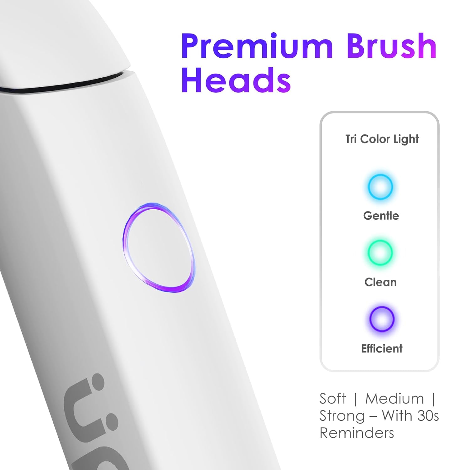 - 4️⃣ 3 Cleaning Modes + Built-in Smart Timer Simplify your oral care with 3 gentle brushing modes—Soft, Medium, and Strong. The built-in timer supports the recommended 2-minute routine, with automatic 30-second reminders to help you brush evenly.