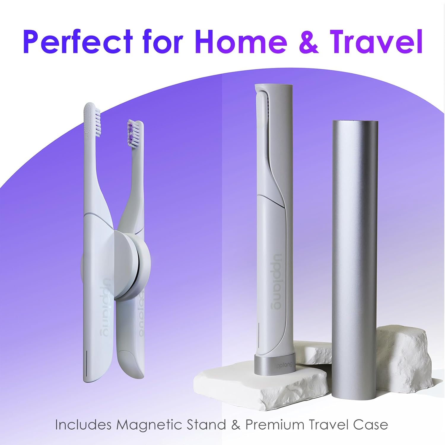 - 2️⃣ Perfect for Home and Travel Use At home, the magnetic wall-mount stand keeps your toothbrush elevated to avoid moisture buildup. For travel, the included premium aluminum case keeps your toothbrush clean and secure. Compact, hygienic, and easy to carry.