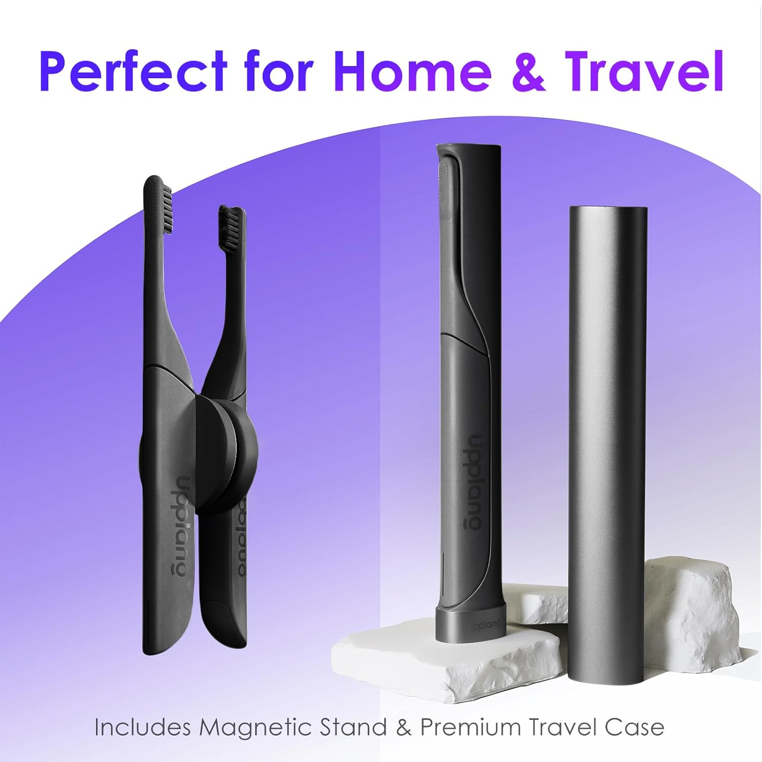- 2️⃣ Perfect for Home and Travel Use At home, the magnetic wall-mount stand keeps your toothbrush elevated to avoid moisture buildup. For travel, the included premium aluminum case keeps your toothbrush clean and secure. Compact, hygienic, and easy to carry.
