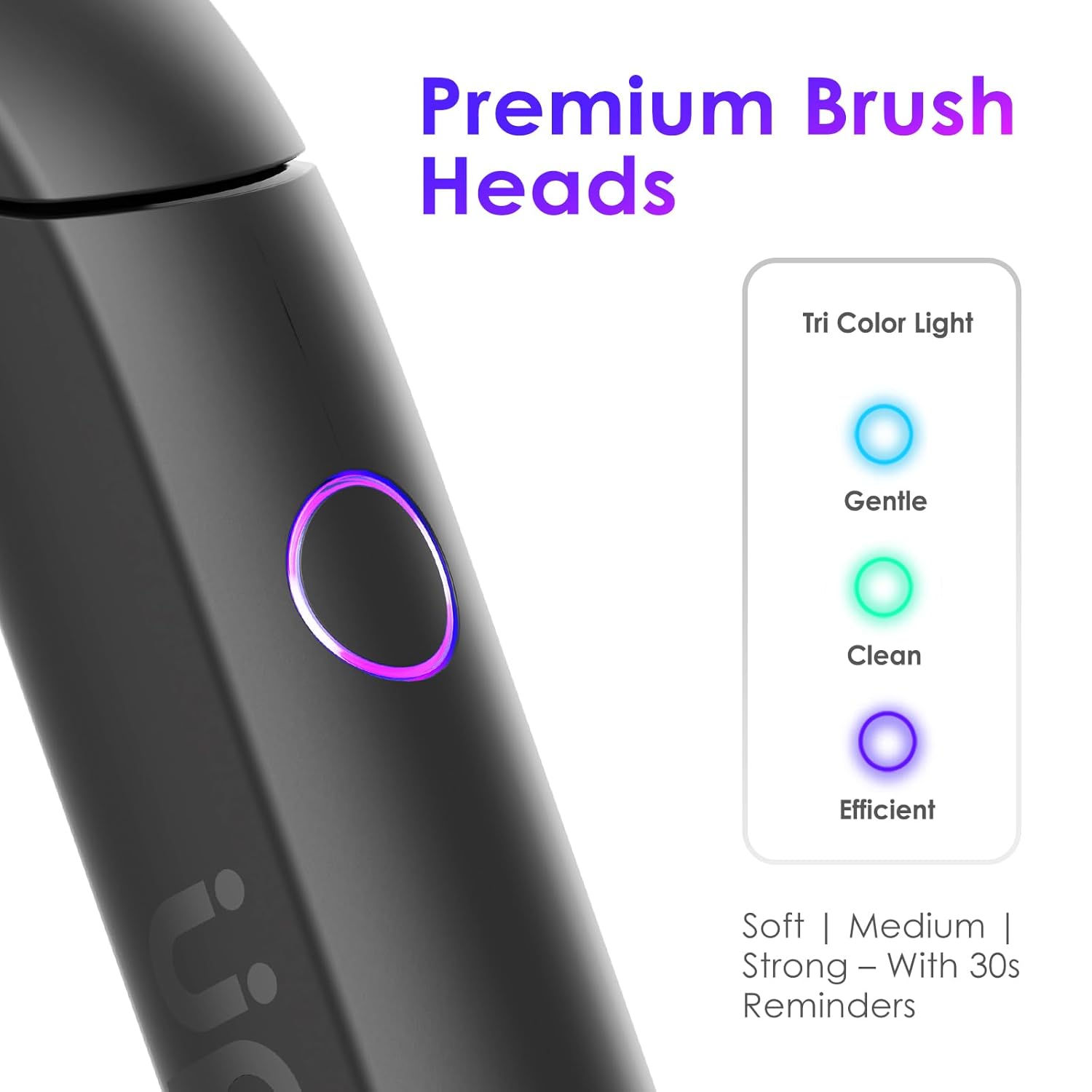 - 4️⃣ 3 Cleaning Modes + Built-in Smart Timer Simplify your oral care with 3 gentle brushing modes—Soft, Medium, and Strong. The built-in timer supports the recommended 2-minute routine, with automatic 30-second reminders to help you brush evenly.