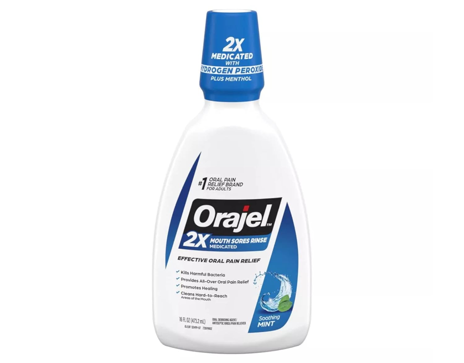 Orajel 2X Medicated Mouth Sores Rinse in Soothing Mint delivers powerful hydrogen peroxide cleansing plus menthol to relieve oral pain from canker sores, braces irritation, denture rubbing, minor dental procedures, and more while aiding in healing and reducing harmful bacteria in the mouth, gums, and hard-to-reach areas with a foaming action that flushes out irritants, mucus, and debris from mouth wounds and gum inflammation while offering a fresh mint flavor for daily comfort and support for adults and children over 2 years of age.