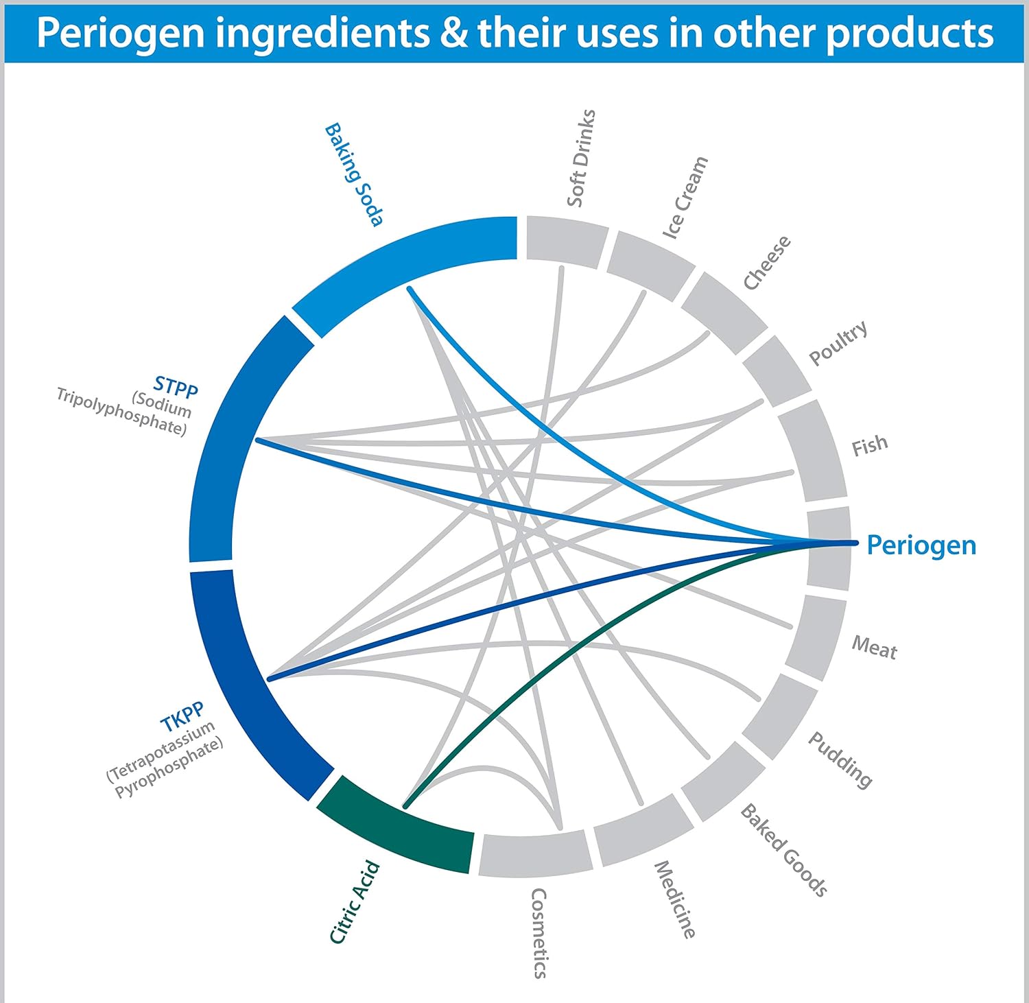 - Lowest Cost; One Periogen 3 ounce bottle of powdered concentrate makes 3 gallons of rinse at pennies per liquid ounce