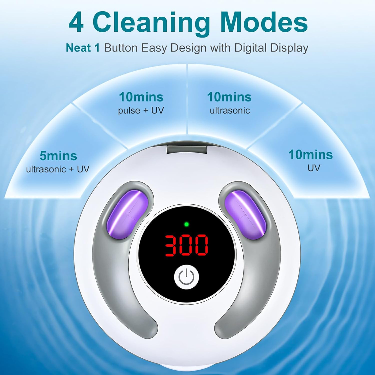 - ✅【360° UV Deep Cleaning】This cleaner features 4 UV lamps that provide full 360° coverage for a deeper clean. The 245nm UV lights help neutralize odors while delivering 3x the cleaning power of manual brushing. For added safety, the UV lamps automatically shut off when opened—protecting your eyes and skin.