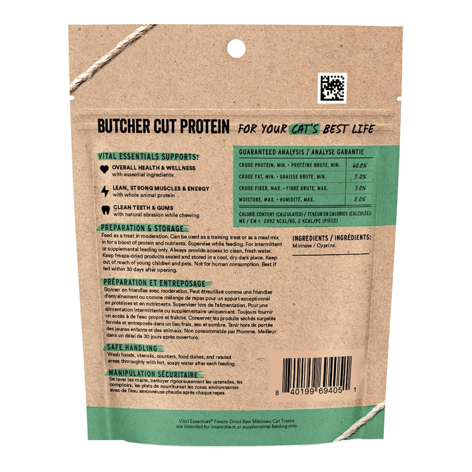 - FREEZE-DRIED RAW MINNOWS CAT TREAT: Vital Essentials Freeze Dried Cat Treats pack more protein than industry standard into every bite to deliver the peak vitality your dog deserves. Our natural freeze-dried raw cat treats are made from responsibly sourced premium minnows.