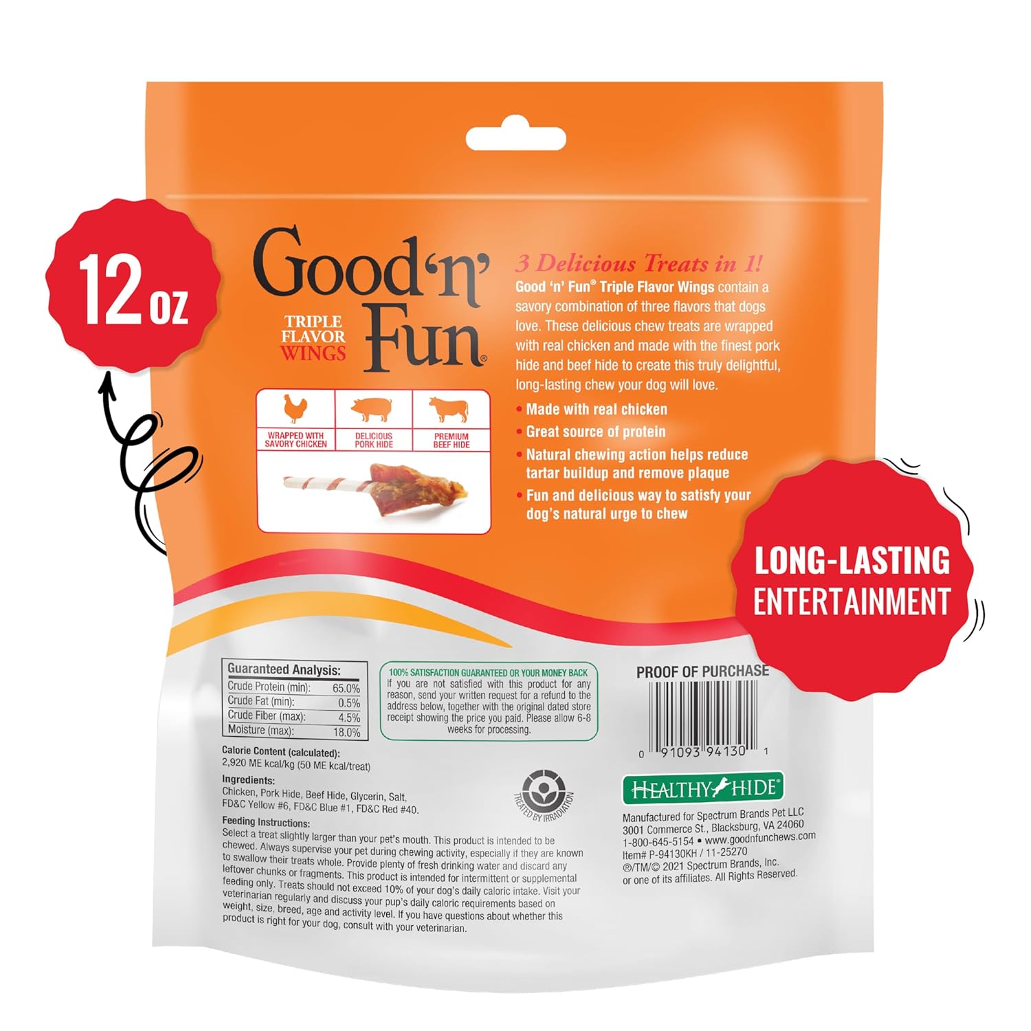 - TRIPLE FLAVOR BEEF HIDE CHEW: Good ‘n’ Fun Triple Flavor Wings are made with premium chicken, delicious pork hide and long-lasting beef hide.