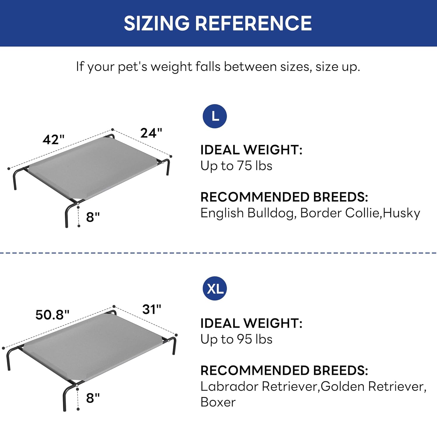 - 【Product Dimensions】This raised dog bed measures 50.8″ L x 31.5″ W x 8″ H (elevated sleeping area: 43.3″ x 31″) .Supports dogs up to 95 lbs