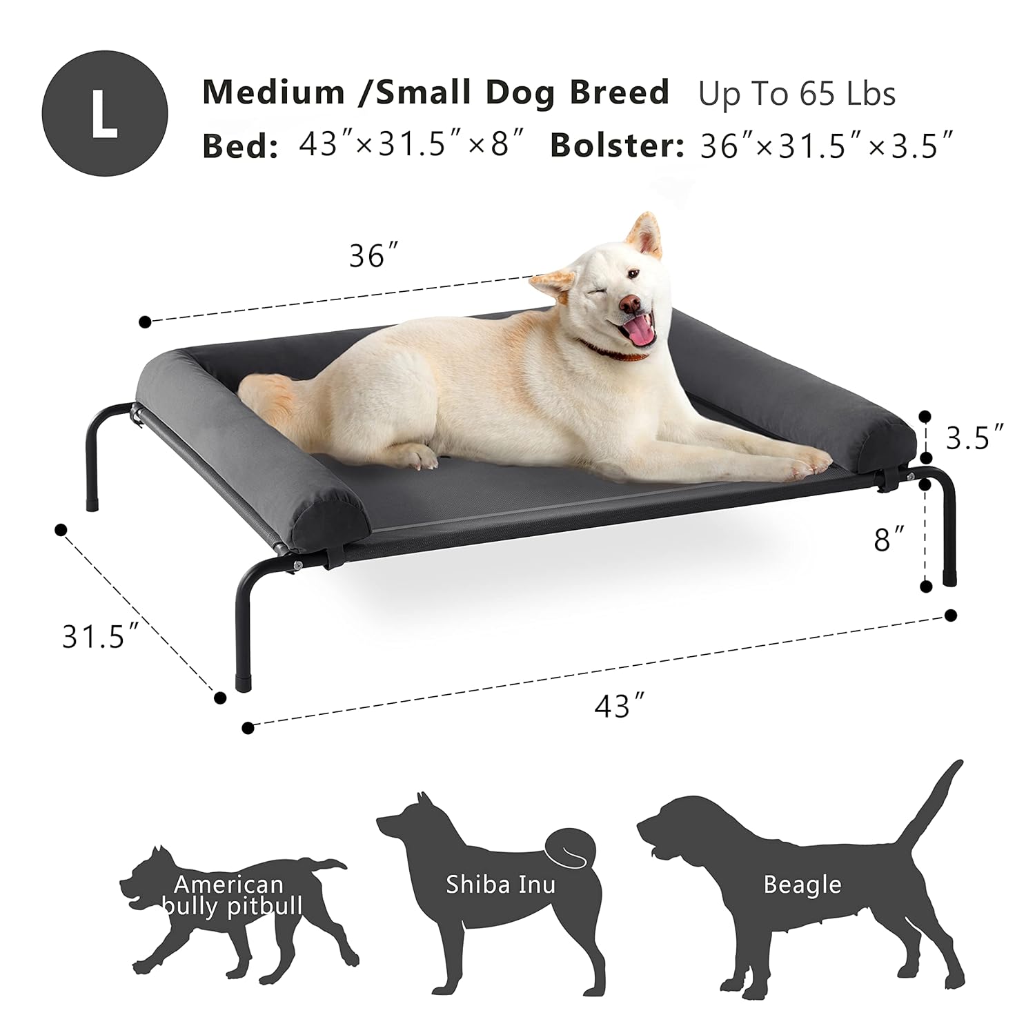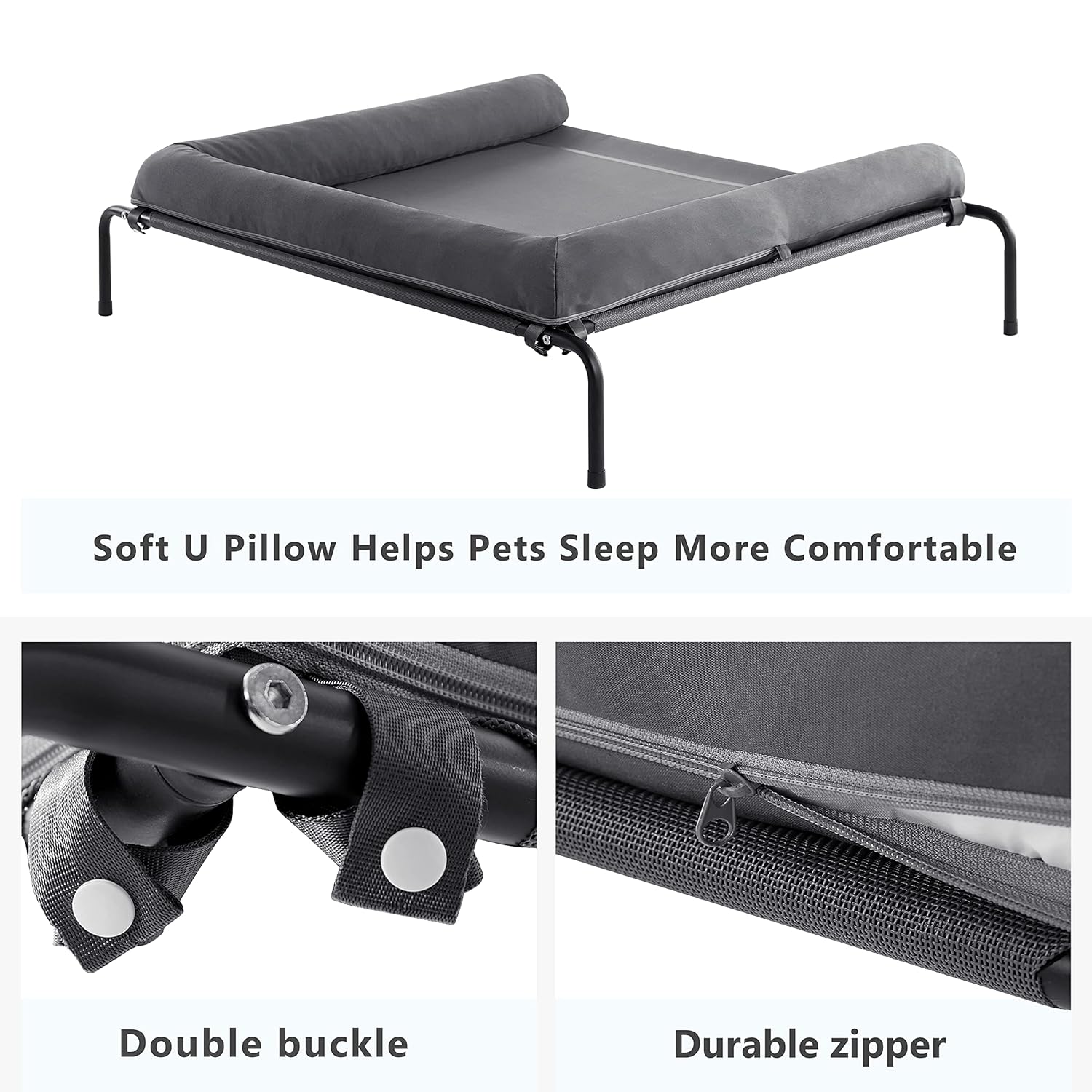 - 【Relax Neck & Perfect Size】The heavy-denier, three-sided surround soft U pillow is tightly fixed around the outdoor dog bed by buttons, which can be used for pets to lean on while resting. Suspended, flexible bed reduces stress at all joints. Provide enough comfortable resting space for the dog. Medium size outdoor dog bed up to 65 pounds; suitable for American bully pitbull, Shiba Inu, Beagle andetc.