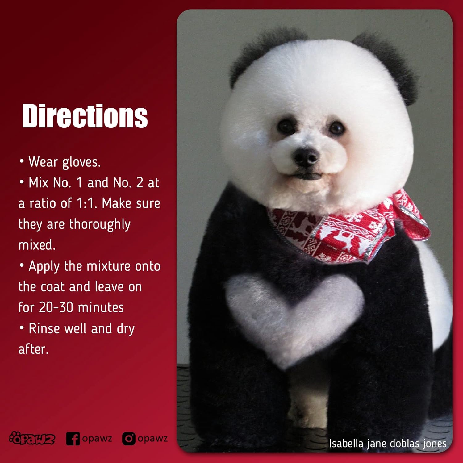- Dog Hair Dye Directions: 1. Shampoo well and blow-dry. 2. Mix No.1 with No. 2 with a ratio of 1:1, making sure they are thoroughly mixed. 3. Apply the mixture on the coat and leave for 20-30 minutes. 4. Rinse well and dry after.
