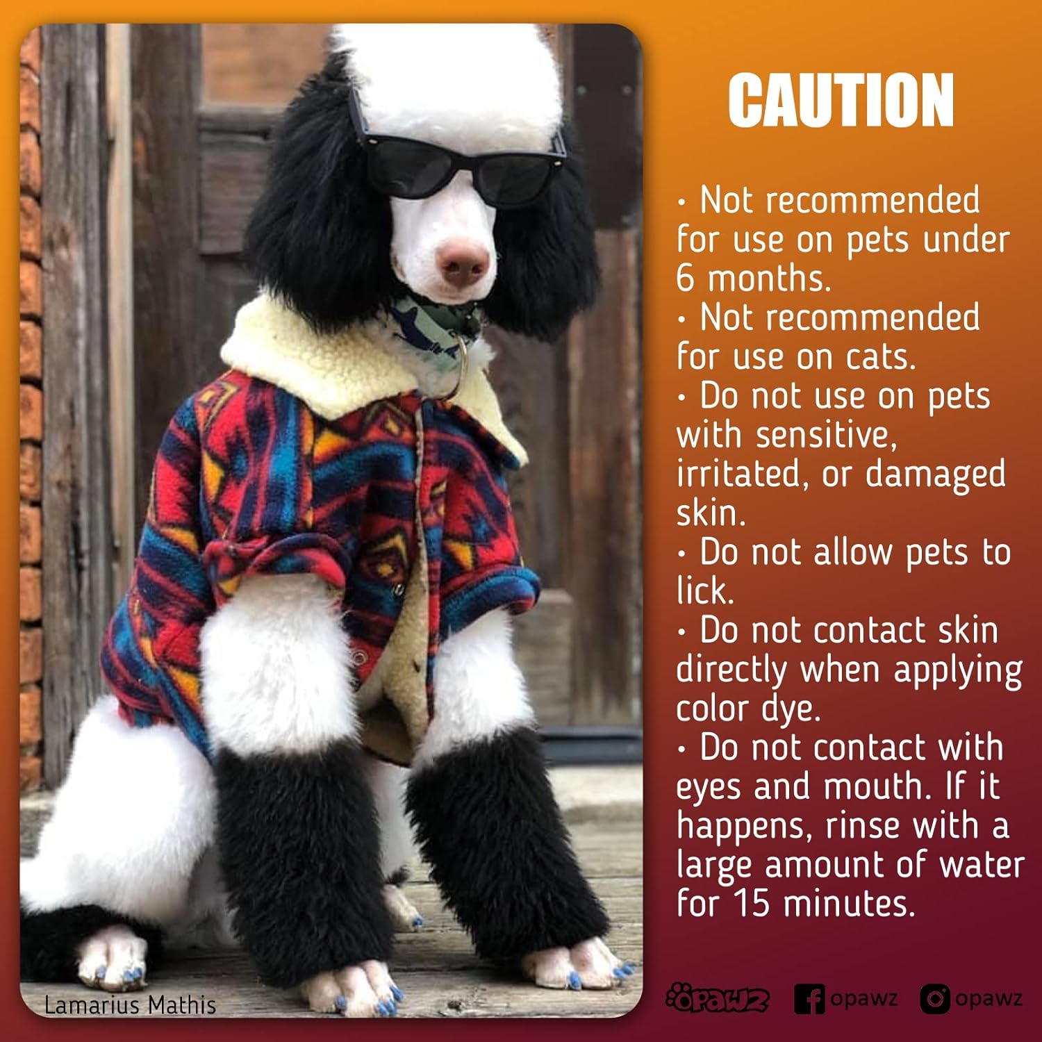 - Note: 1. Be sure to stir dog fur dye well with a brush before use. 2. For coloring limited areas, such as ears or tails, you may apply to dry fur. 3. Results may vary depending on application strength and individual pet’s coat. 4. Coloring results may vary with coat type and breed. 5. Results may vary depending on application strength and individual pet’s coat. 6. Coloring results may vary with coat type and breed. 7. Safe for pets over 6 months old.