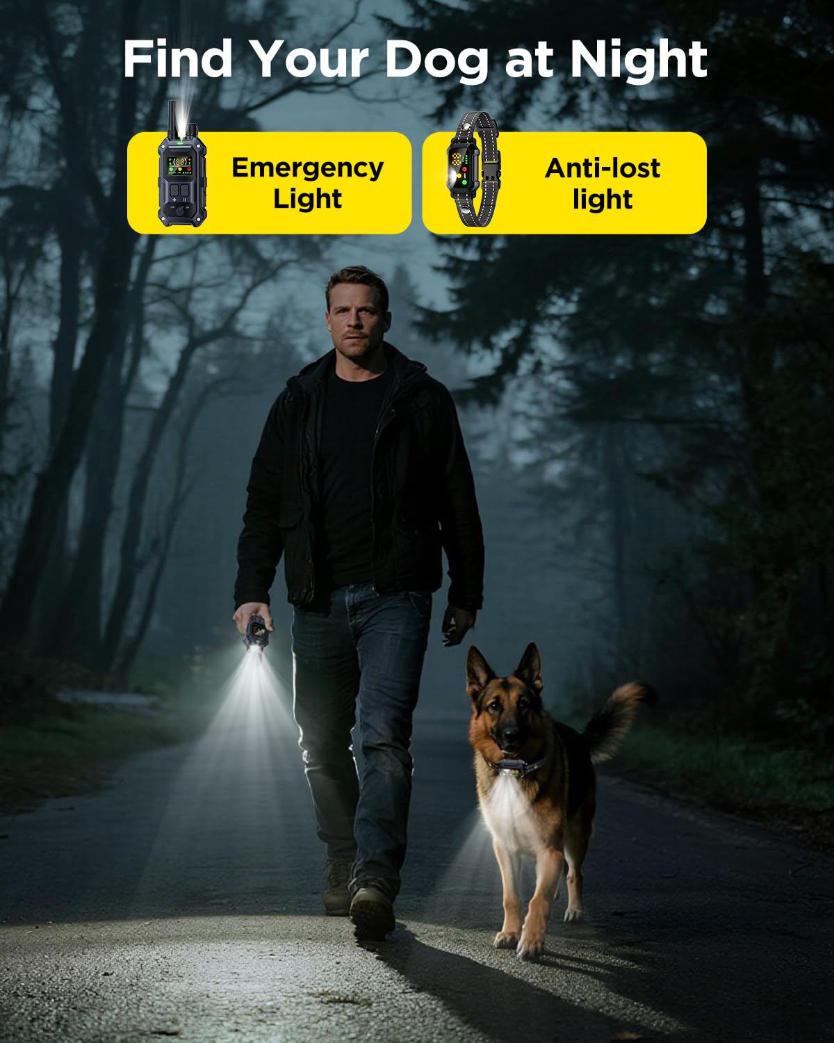 - 【Find Your Dog at Night】The dog shock collar with remote control features dual lighting: Remote-controlled flashlight + collar-mounted strobe light for night visibility. Use the remote’s beam to scan dark trails, dense woods, or foggy campsites when your dog is out of sight. Instantly activate the collar’s strobe to track your dog or help them locate you. This two-way lighting system ensures connection when it matters most.