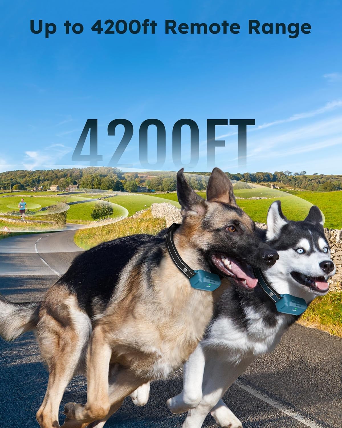 - 【Extended 4200FT Range & 2 Channel】With 4200FT impressive range, you can now have complete freedom while training your dog at the park, beach or in your backyard! The e collar supports 2 channels and has memory function for settings, easy to train 2 dogs simultaneously without resetting levels.